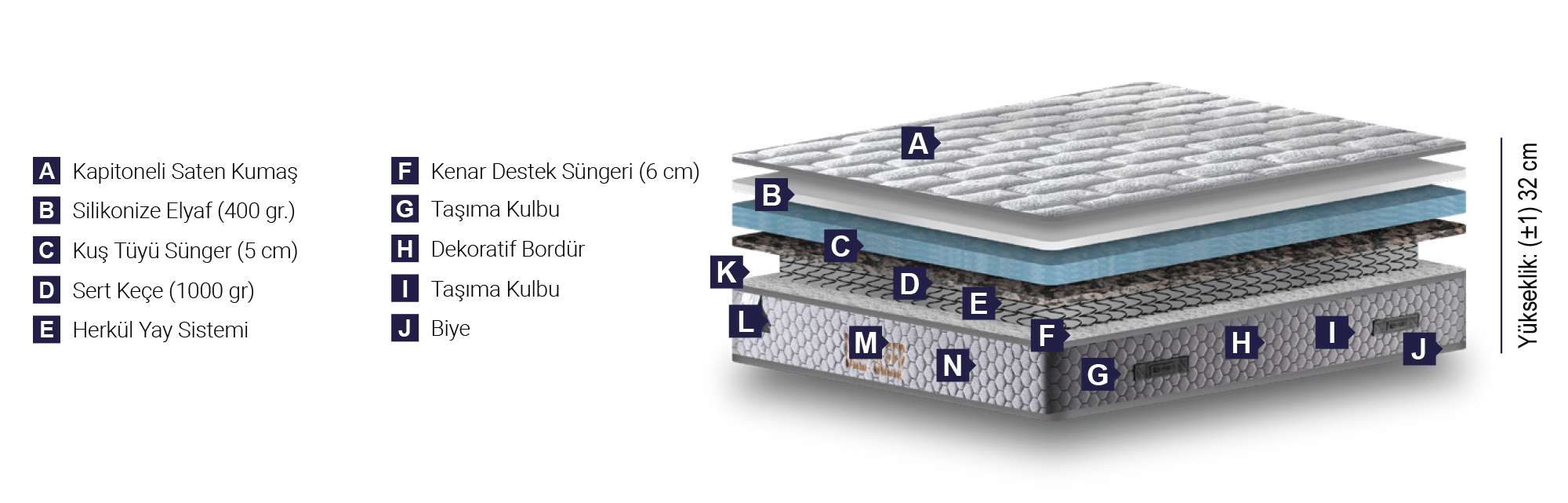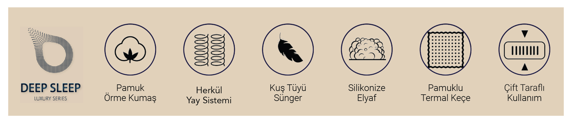 Deep Sleep Yatak Set, adını hak eden derin ve kesintisiz bir uyku deneyimi sunmak için tasarlandı. Kapitoneli saten kumaşıyla estetik bir görünüm kazandırırken, pamuklu termal keçe ve kuş tüyü sünger katmanları sayesinde ekstra yumuşaklık sağlar. Herkül yay sistemi omurganıza güçlü ve dengeli destek verir, çift taraflı kullanım özelliği ise yatağın uzun yıllar formunu korumasına yardımcı olur. Silikonize elyaf dolgusu ile hem konforu hem de dayanıklılığı artırır.