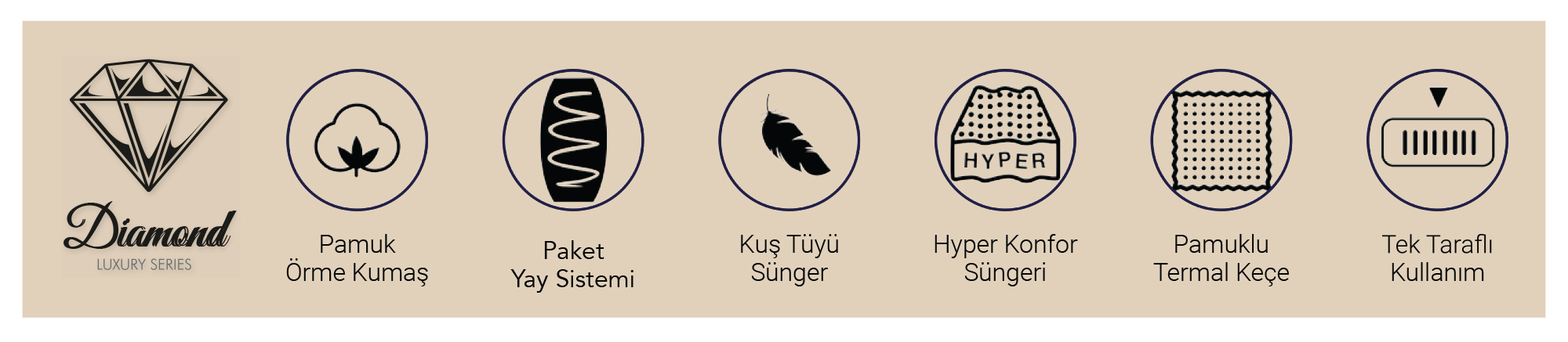 Diamond Yatak Set, adını taşıdığı gibi uykuya değer katan özel bir tasarıma sahiptir. Diamond pamuk örme kumaşıyla nefes alabilen, cilde dost bir yüzey sunar. Pamuklu termal keçe ve kuş tüyü sünger katmanları, yumuşacık bir uyku deneyimi sağlarken; paket yay sistemi vücudu ideal şekilde destekler ve omurga sağlığını korur. Hyper konfor süngeri ile güçlendirilmiş yapısı, basınç noktalarını azaltarak kesintisiz bir uyku konforu sunar. Tek taraflı kullanım özelliği sayesinde uzun süreli dayanıklılıkla ilk günkü rahatlığını korur.
