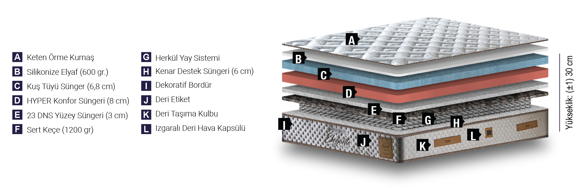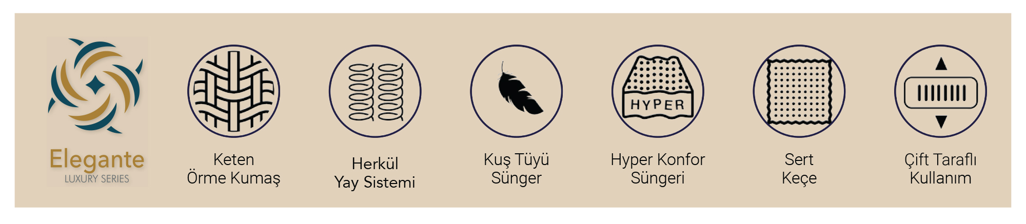 Elegante Yatak Set, adını yansıtan zarif tasarımıyla estetik ve konforu bir arada sunar. Keten örme kumaşı doğal dokusuyla uykuya huzur katarken, kuş tüyü sünger ve Hyper konfor süngeri ekstra yumuşaklık ve rahatlık sağlar. Sert keçe ve Herkül yay sistemi, omurgaya güçlü ve dengeli destek vererek sağlıklı bir uyku pozisyonu oluşturur. Çift taraflı kullanım özelliği sayesinde uzun ömürlüdür ve yıllarca konforunu korur.