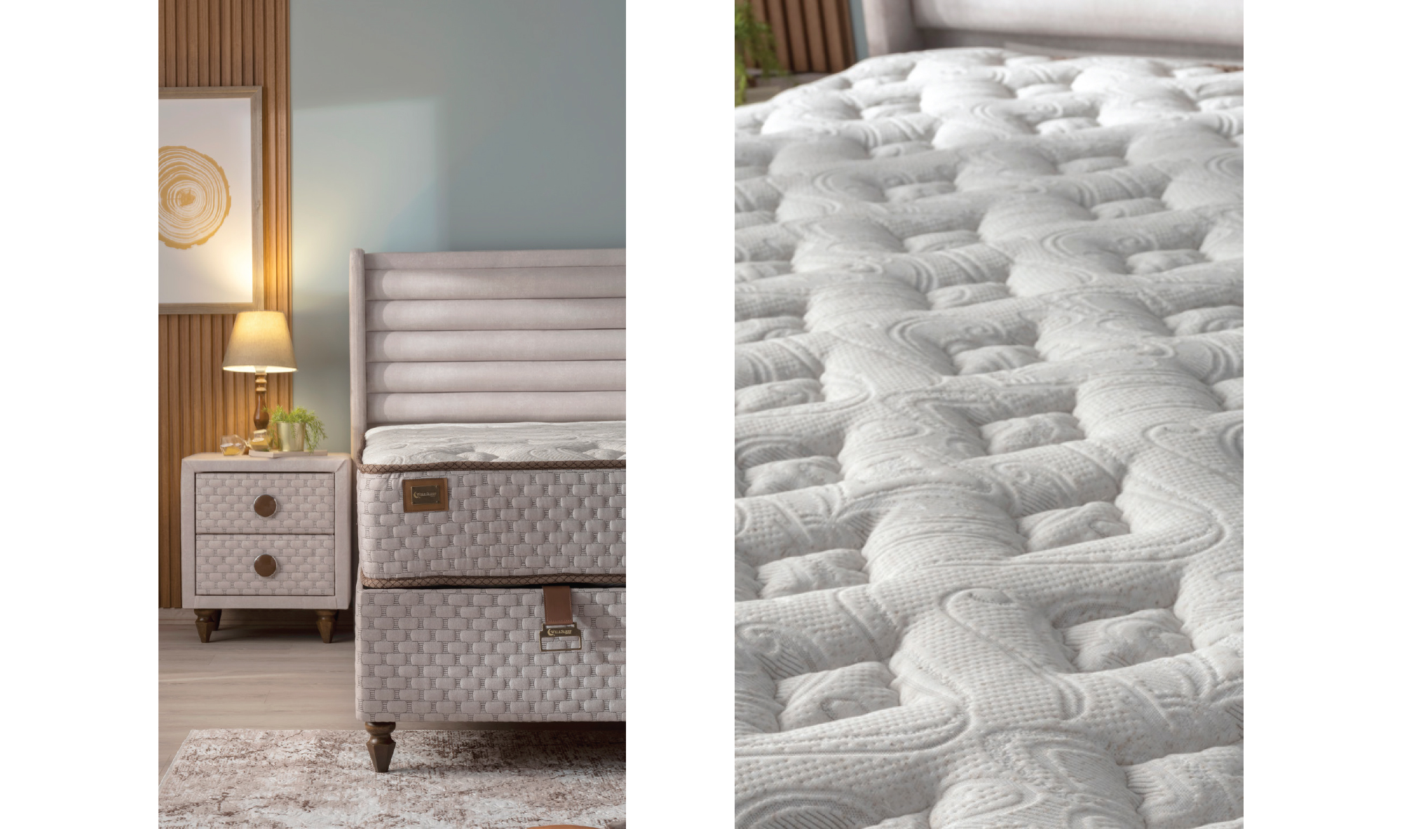 Elegante Yatak Set, adını yansıtan zarif tasarımıyla estetik ve konforu bir arada sunar. Keten örme kumaşı doğal dokusuyla uykuya huzur katarken, kuş tüyü sünger ve Hyper konfor süngeri ekstra yumuşaklık ve rahatlık sağlar. Sert keçe ve Herkül yay sistemi, omurgaya güçlü ve dengeli destek vererek sağlıklı bir uyku pozisyonu oluşturur. Çift taraflı kullanım özelliği sayesinde uzun ömürlüdür ve yıllarca konforunu korur.