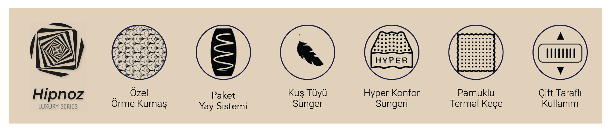 Hipnoz Yatak Set, uykuya dalmayı kolaylaştıran konforu ve şıklığı bir arada sunar. Özel örme kumaşı ve pamuklu termal keçesi sayesinde nefes alabilen bir uyku yüzeyi oluştururken, kuş tüyü sünger katmanı yumuşacık bir dokunuş sağlar. Paket yay sistemi, vücudu ideal şekilde destekleyerek omurga sağlığını korur. Hyper konfor süngeri ile güçlendirilmiş yapısı basınç noktalarını azaltır, çift taraflı kullanım özelliği ise yatağın uzun ömürlü olmasını sağlar.