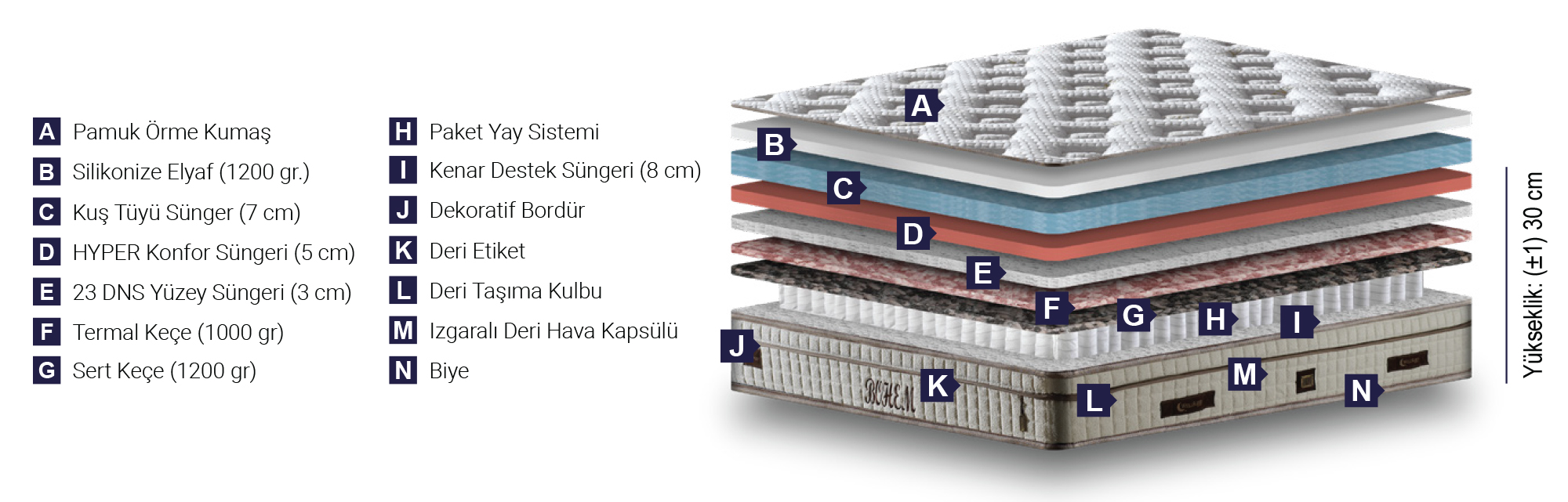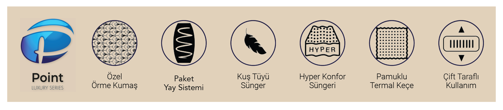 Point Yatak Set, modern tasarımıyla estetik görünümü ve ileri teknolojiyle üretilmiş yapısıyla dikkat çeker. Pamuk örme kumaşı sayesinde cilde dost, nefes alabilen bir yüzey sunar. İçerisindeki pamuklu termal keçe ve kuş tüyü sünger katmanları, gece boyunca yumuşaklık ve ekstra konfor sağlarken, paket yay sistemi omurganıza doğru desteği vererek sağlıklı bir uyku pozisyonu oluşturur. Hyper konfor süngeriyle güçlendirilen yapısı, vücut ağırlığını dengeli bir şekilde dağıtır. Çift taraflı kullanım özelliği ise uzun ömürlü bir kullanım imkânı sunar.
