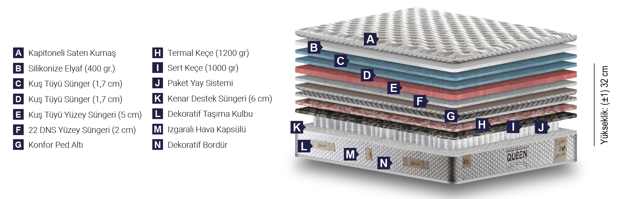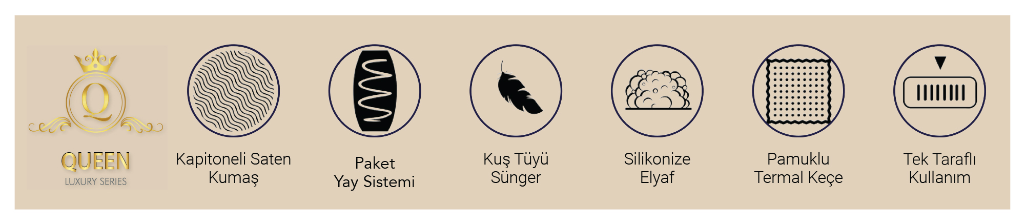 Queen Yatak Set, şıklığı ve konforu aynı anda sunan özel bir tasarıma sahiptir. Kapitoneli saten kumaşıyla yatak odanıza zarafet katarken, pamuklu termal keçe ve kuş tüyü sünger katmanları ile yumuşacık bir uyku yüzeyi sağlar. Paket yay sistemi omurganıza ihtiyacı olan desteği sunarken, silikonize elyaf dolgusu konforu artırır. Tek taraflı kullanım özelliği ve dayanıklı yapısı sayesinde uzun yıllar ilk günkü rahatlığını korur.