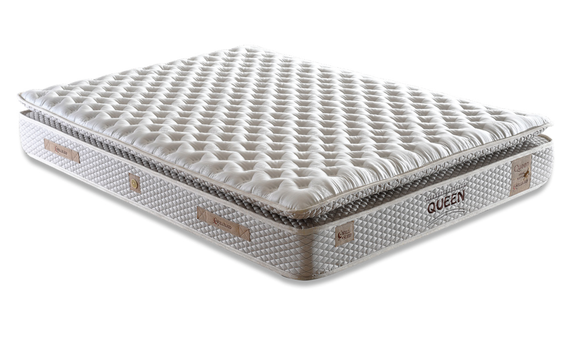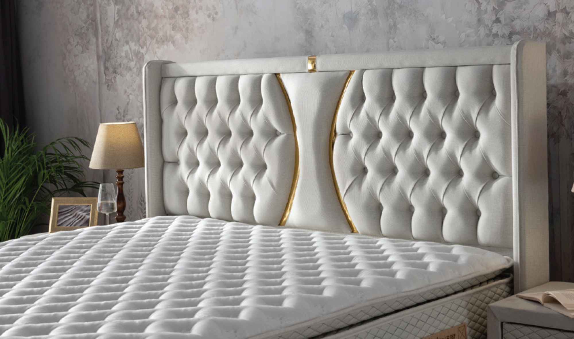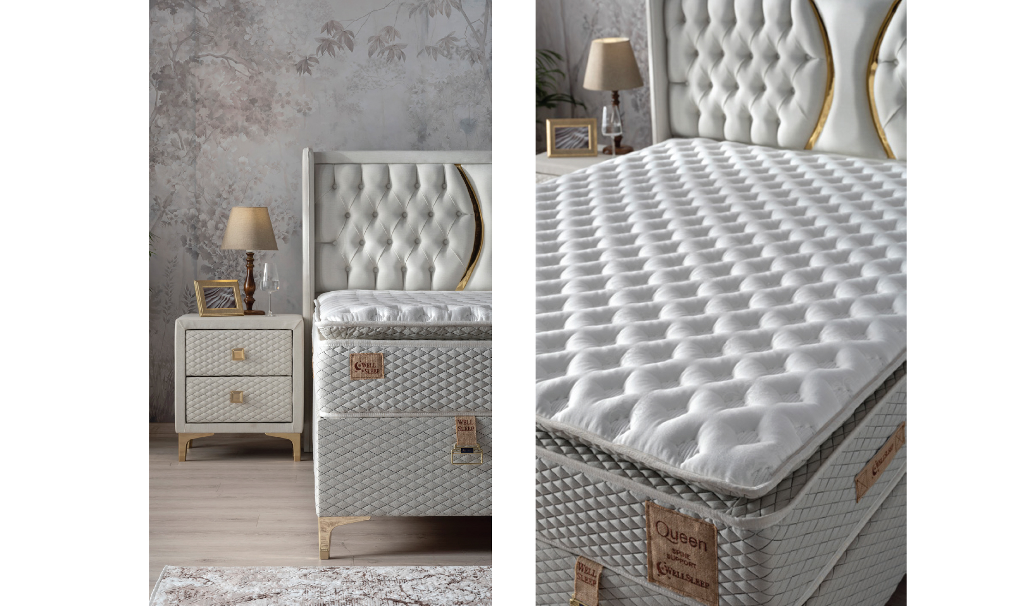 Queen Yatak Set, şıklığı ve konforu aynı anda sunan özel bir tasarıma sahiptir. Kapitoneli saten kumaşıyla yatak odanıza zarafet katarken, pamuklu termal keçe ve kuş tüyü sünger katmanları ile yumuşacık bir uyku yüzeyi sağlar. Paket yay sistemi omurganıza ihtiyacı olan desteği sunarken, silikonize elyaf dolgusu konforu artırır. Tek taraflı kullanım özelliği ve dayanıklı yapısı sayesinde uzun yıllar ilk günkü rahatlığını korur.