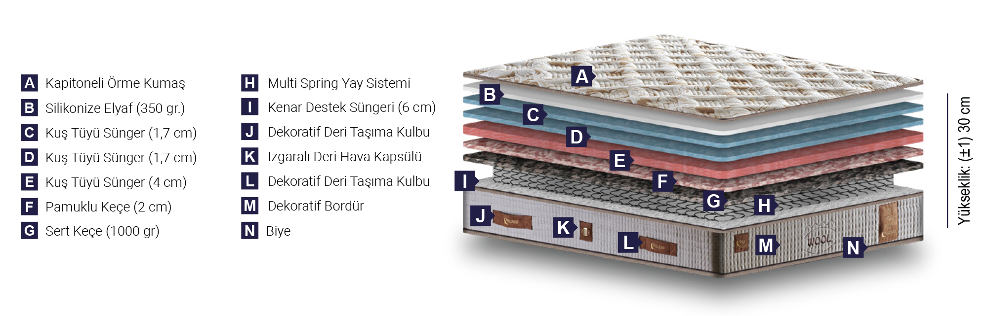 Wool Yatak Set, doğallığı ve konforu bir araya getiren yapısıyla öne çıkar. Özel kapitoneli örme kumaşı ve pamuklu termal keçesi sayesinde nefes alabilen bir uyku yüzeyi sunarken, kuş tüyü sünger katmanları yumuşacık bir his verir. Multi Spring yay sistemi, omurganıza ihtiyaç duyduğu desteği sağlayarak sağlıklı bir uyku pozisyonu oluşturur. Silikonize elyaf dolgusu ekstra yumuşaklık ve dayanıklılık kazandırır. Tek taraflı kullanım özelliği ile pratik ve uzun ömürlü bir kullanım sunar.